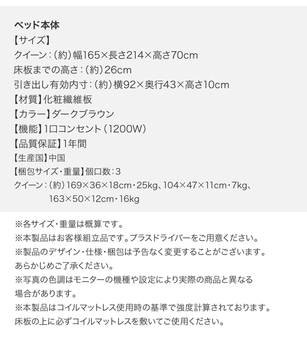 クイーンサイズ コンセント付き収納ベッド