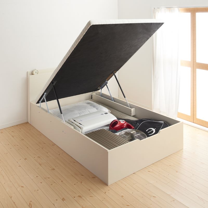 まるで倉庫のような大容量の跳ね上げ式ベッドはあなたの収納問題を解決致します。サイズはセミシングル・シングル・セミダブルの3サイズをご用意しました。