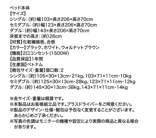 カラーはスタイリッシュな部屋づくりに最適な、モダンな3カラー。ウォルナットブラウン、ホワイト、ブラックをご用意。サイズはシングル、セミダブル、ダブルの3サイズ。マットレスは寝心地の異なる全6種類から、お好みの寝心地をお選びください。