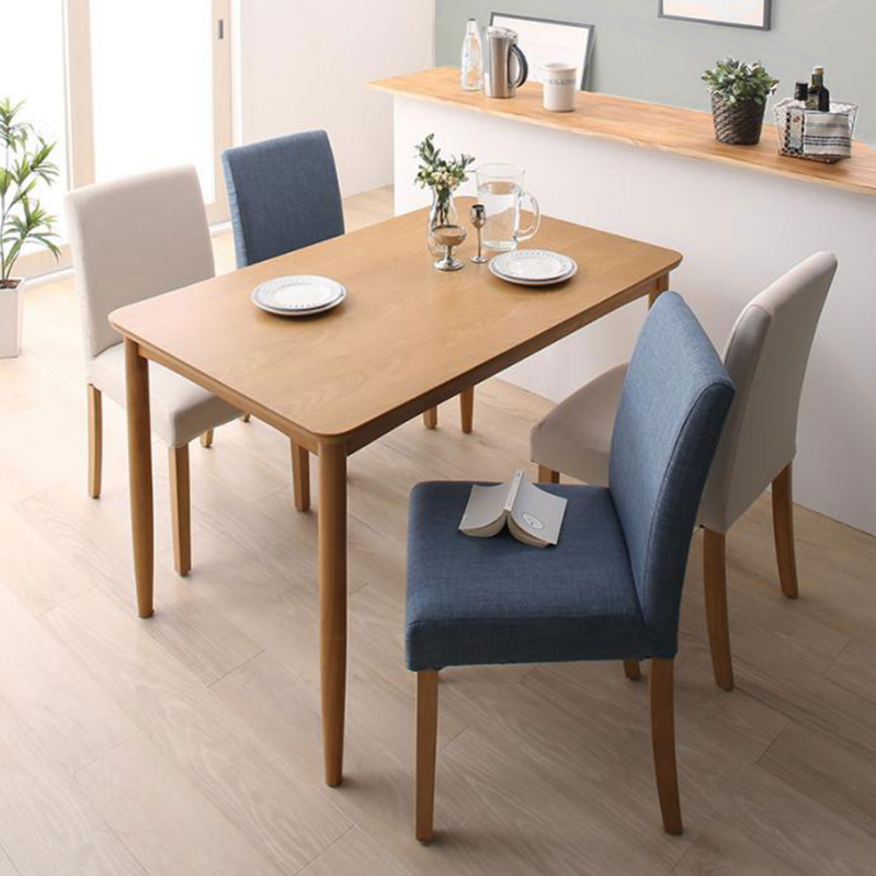 自然の風合い溢れる天然木ダイニングテーブルと、北欧風ファブリックカバーリングチェアを組み合わせた、天然木ダイニングテーブルセット「クインテッド」。