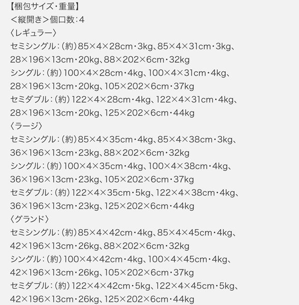 セミシングル:(約)85×4×42cm・4kg、85×4×45cm・4kg、42×196×13cm・26kg、88×202×6cm・32kg