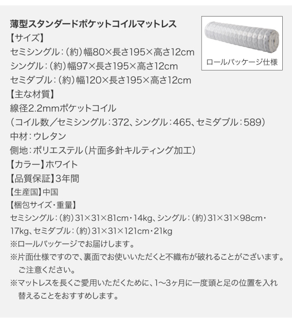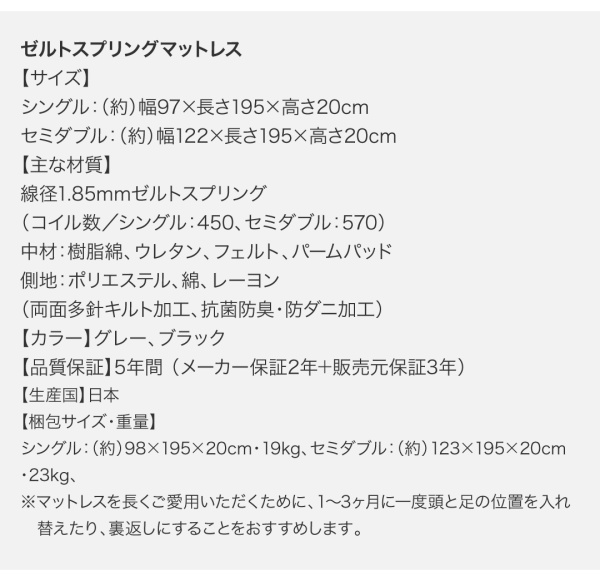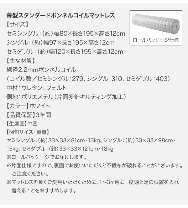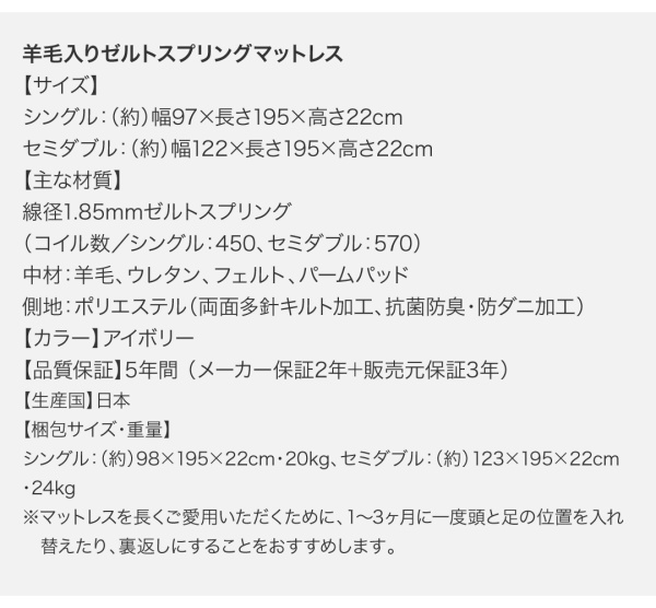 ※本製品はコイルマットレス使用時の基準で強度計算されております。床板の上に必ずコイルマットレスを敷いてご使用ください。