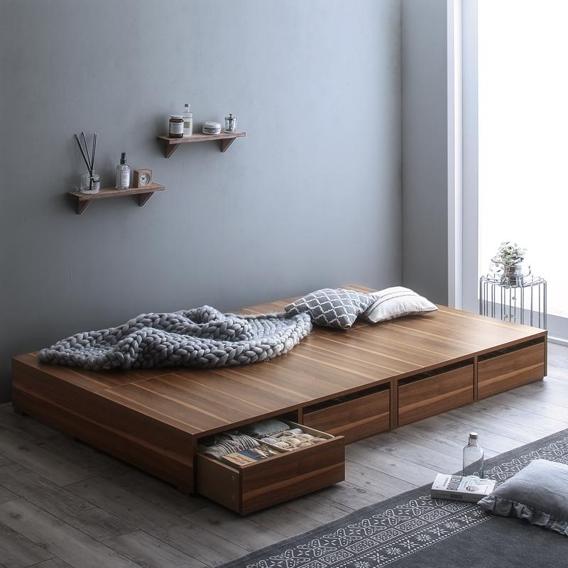 開放的な空間をつくりだすローベッドに、選べる引出収納付き。たっぷりの収納力もスマートに手に入ります。また、布団を片付ければ小上がりにもなる賢いつくり。