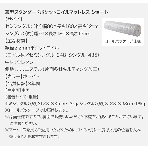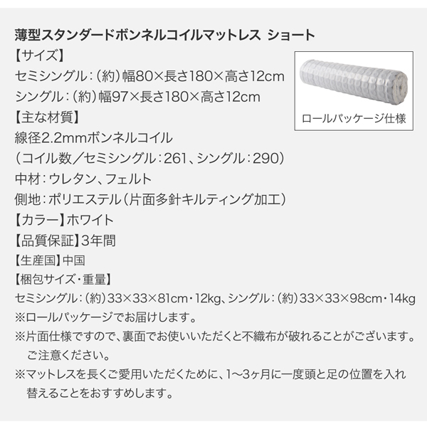 ショート丈のベッドにぴったり合うマットレスをご用意。お部屋に圧迫感がでないよう、薄型のマットレスをセットにしております。