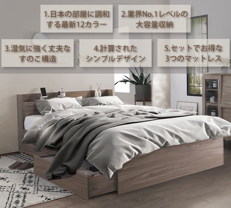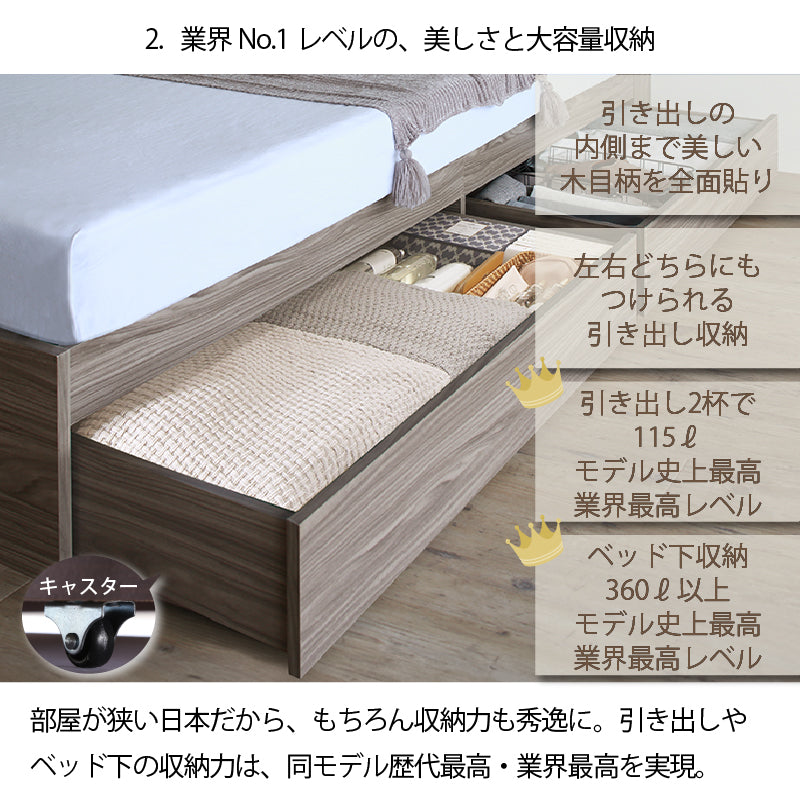 ※【業界最高レベルの収納力】はEC市場で一般に販売される同クラス2杯引き出し収納付きベッドとの比較においてです。